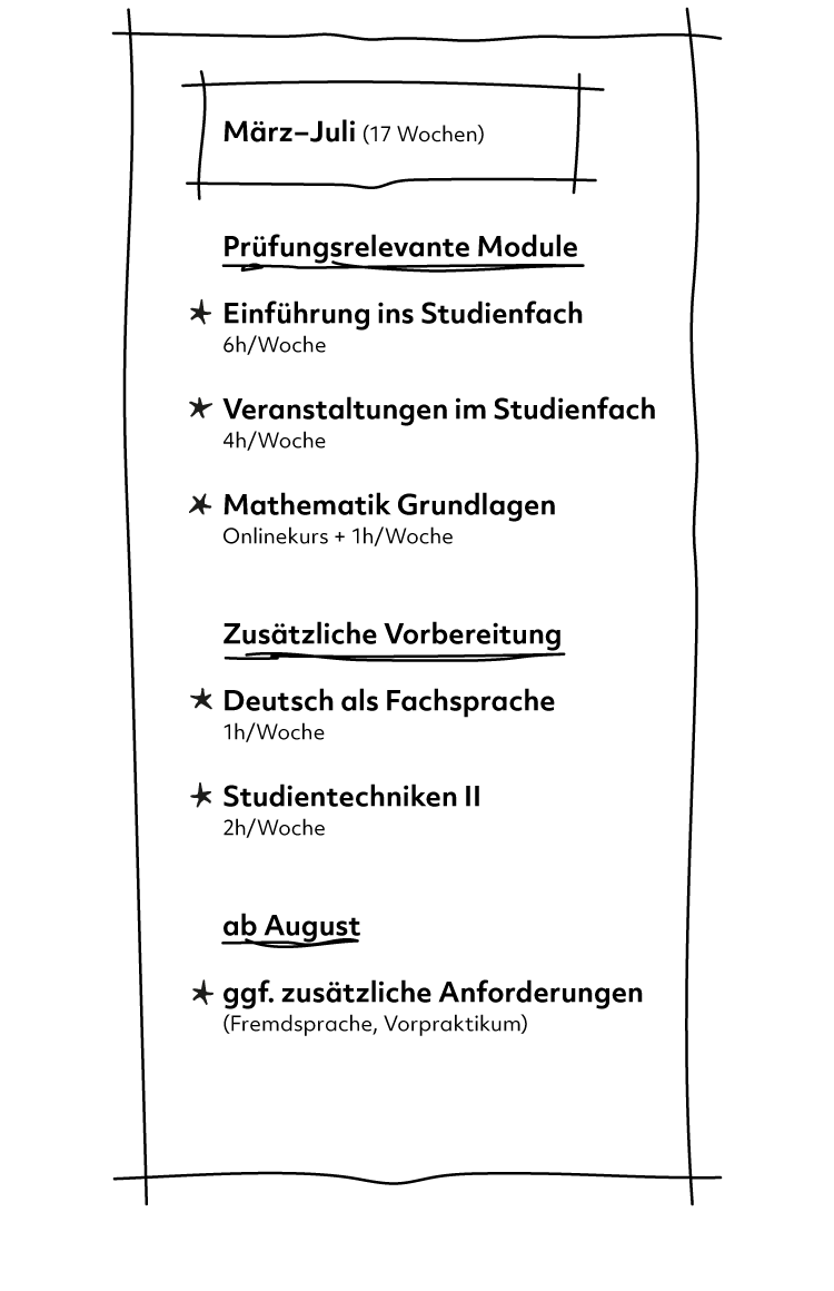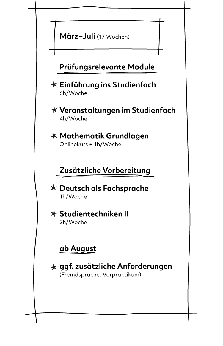 Um Ihr persönliches Studienfach gut kennenlernen zu können, erhalten Sie erst eine allgemeine Einführung in das Studienfach und besuchen dann reguläre Veranstaltungen an der entsprechenden Hochschule. So lernen Sie von Anfang an die Professor*innen und Dozent*innen kennen, können Kontakte zu anderen Studierenden knüpfen und lernen bereits die Fachsprache.